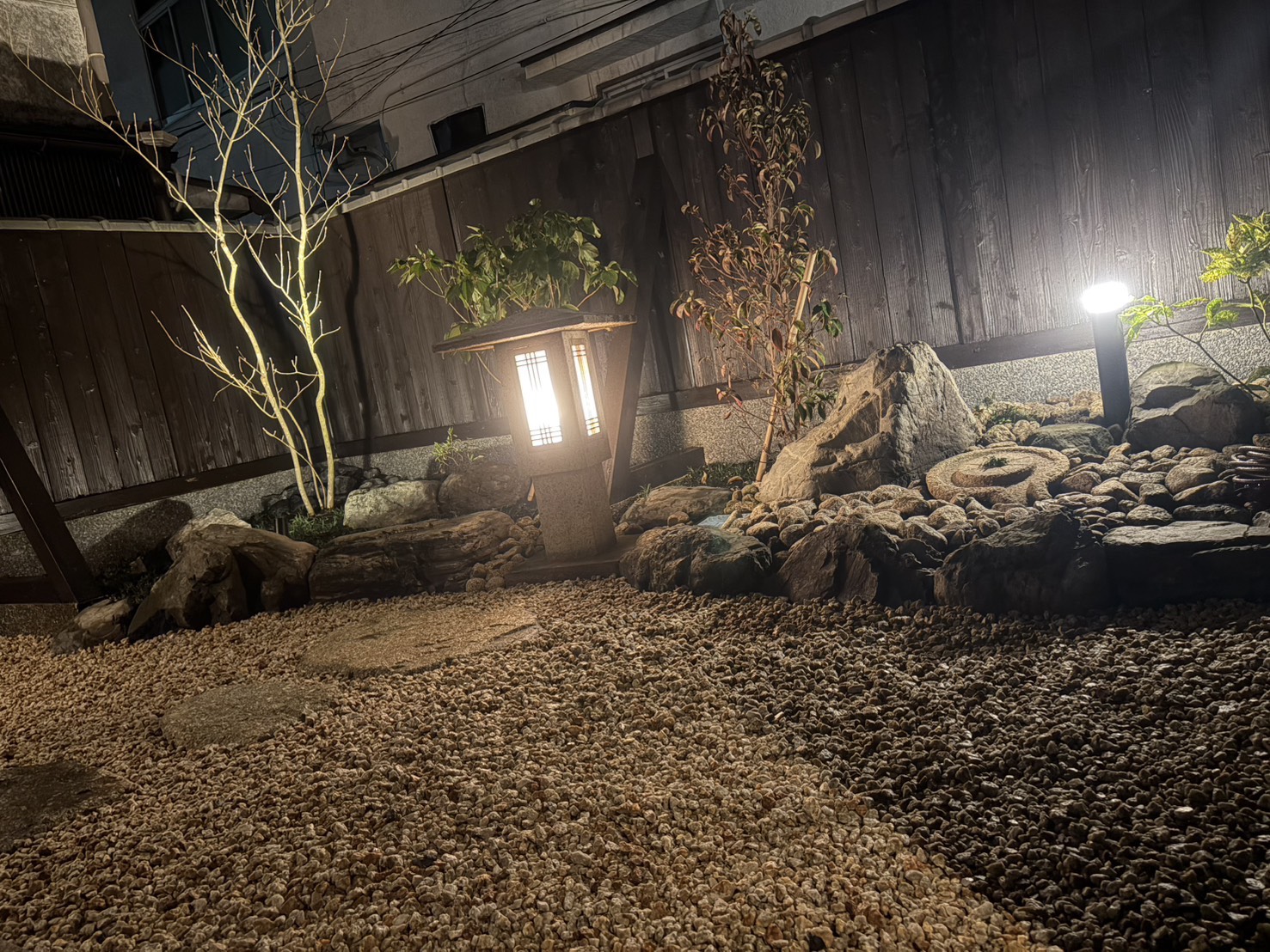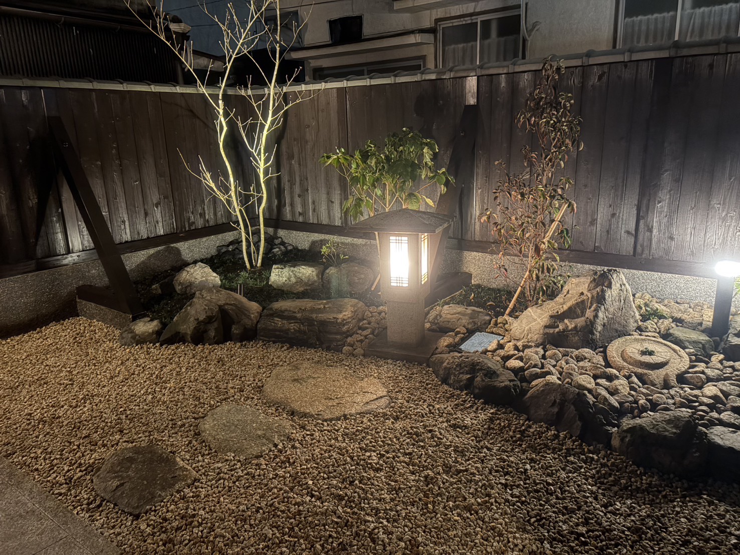 中心に据えた御影石の石灯籠は、昼の自然光の下では落ち着いた白みを帯び、夜はLEDのあかりがじんわりと透けることで、和の情緒を静かに演出します。